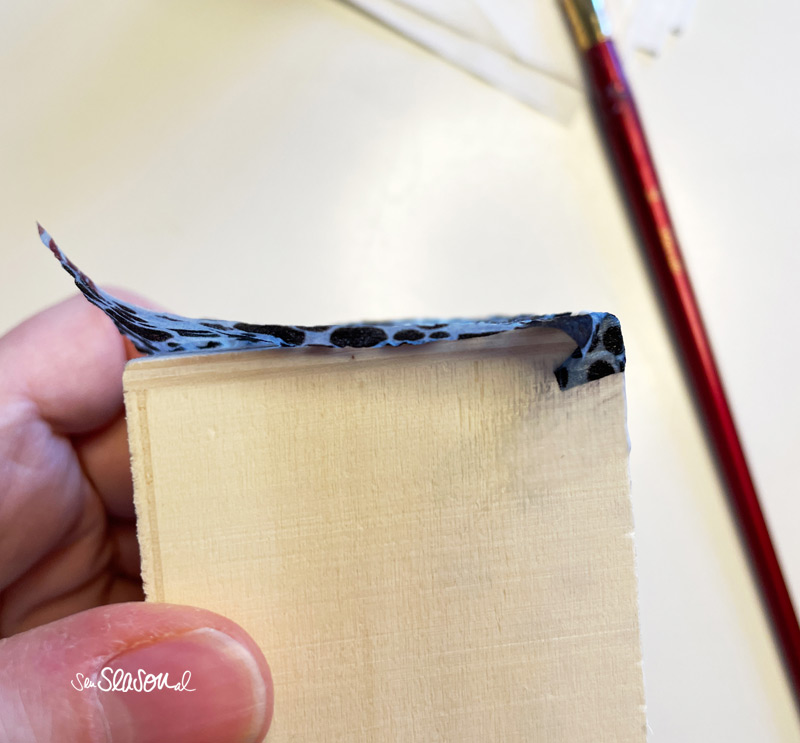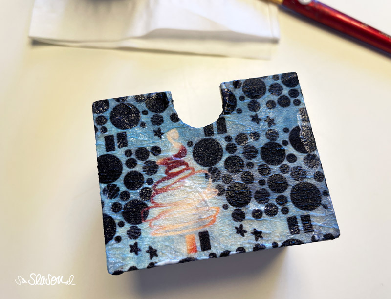 Dann kümmerst du dich um die seitlich überstehenden Enden und klebst auch diese sorgfältig fest. Wenn die komplette Serviette faltenfrei festgeklebt ist, lass alles gut trocknen, am besten über Nacht.