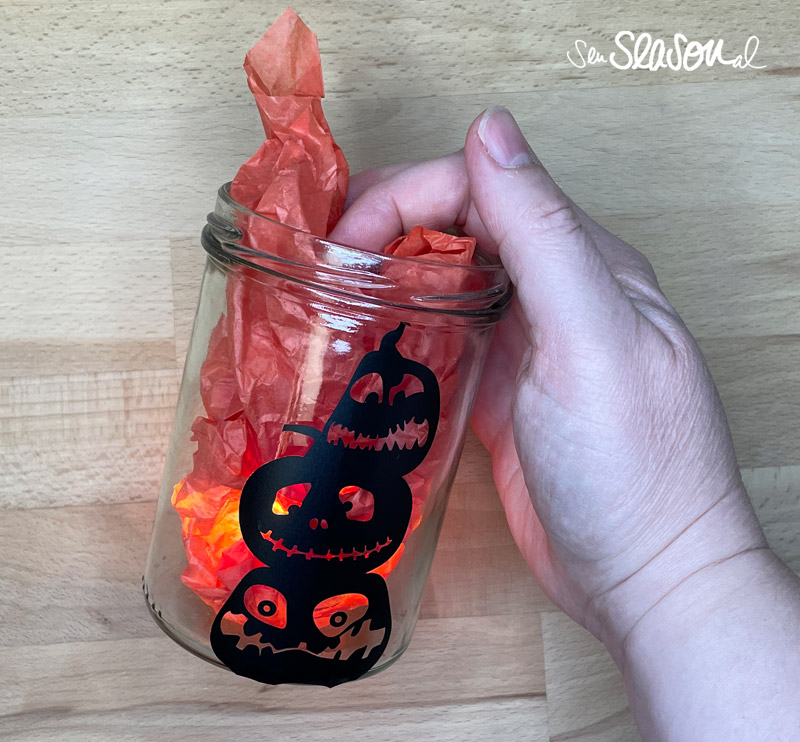 Dieses Mal hatte ich gleich eine Idee, was ich mit den Motiven gestalten könnte. Irgendwo auf Instagram hatte ich die Inspiration dazu gesehen und mir sofort meine Motive damit vorgestellt. Geworden sind es Halloween-Lichter, die nicht – wie die Kürbis-Lichter – nach einer Weile kaputt gehen und schimmeln, sondern nächstes Jahr wieder heraus geholt werden können.